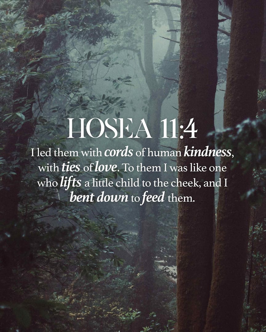 December 8, 2023 Hosea 11:4I led them with cords of human kindness, with ties of love. To them I was like one...