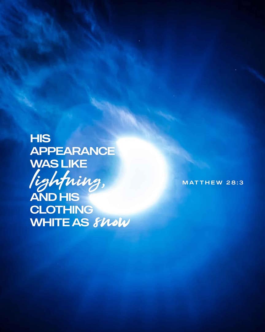 December 6, 2023 Matthew 28:3His appearance was like lightning, and his clothing white as snow.-Matthew 28:3 ESV